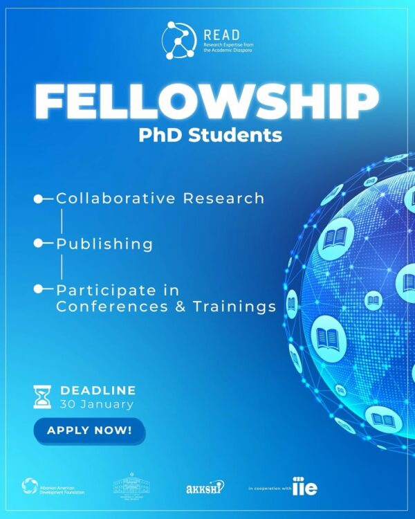 READ Fellowship Call for PhD Students Through the 5th READ Call, PhD students in Albania can collaborate with diaspora scholars and gain exposure to: • Collaborative Research • Publishing • Conferences and Trainings Develop your academic profile and join a global network of researchers shaping Albania’s future. Deadline for applications: January 30th, 2026 Apply Now!